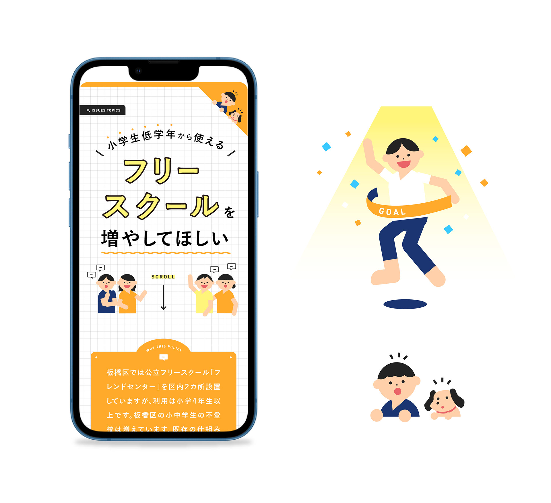 子育て・介護・ペット・自転車など、地域の課題を地元議員にスマホから簡単に相談できるWebサイト「issues」の地元議員の政策をインフォグラフィックを活用し制作しました。